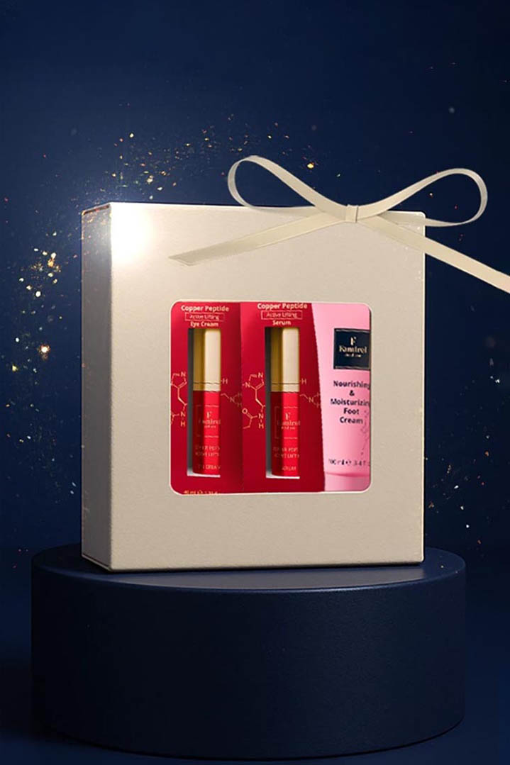 Copper peptide set for fresh and vital facial skin care. Comes with nourishing day cream, restoring night cream, renewing serum, smoothing eye cream and an additional gift from us. A powerful combination that encourages collagen production, renews elasticity, strengthens skin texture and grants moisture, softness and radiance.