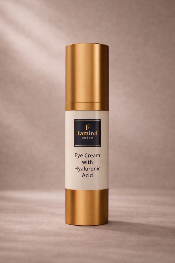 The eye cream has a rich formula containing the main ingredient, hyaluronic acid. This key ingredient effectively pulls in and retains water molecules increasing skin hydration levels. Thanks to the enrichment with a vitamin complex known for its antioxidant and revitalizing effects, the cream helps reduce wrinkles. Such ingredients as aloe extract, chamomile extract, cucumber extract, avocado oil, almond oil, castor oil, including vitamin E, C, retinol (vitamin A), copper tripeptide-1, caprylic, glycerin, dimethicone and urea (carbonyl diamide), moisturize, nourish, soften, even out the skin color, and the Dead Sea salt impregnates with trace elements and minerals.